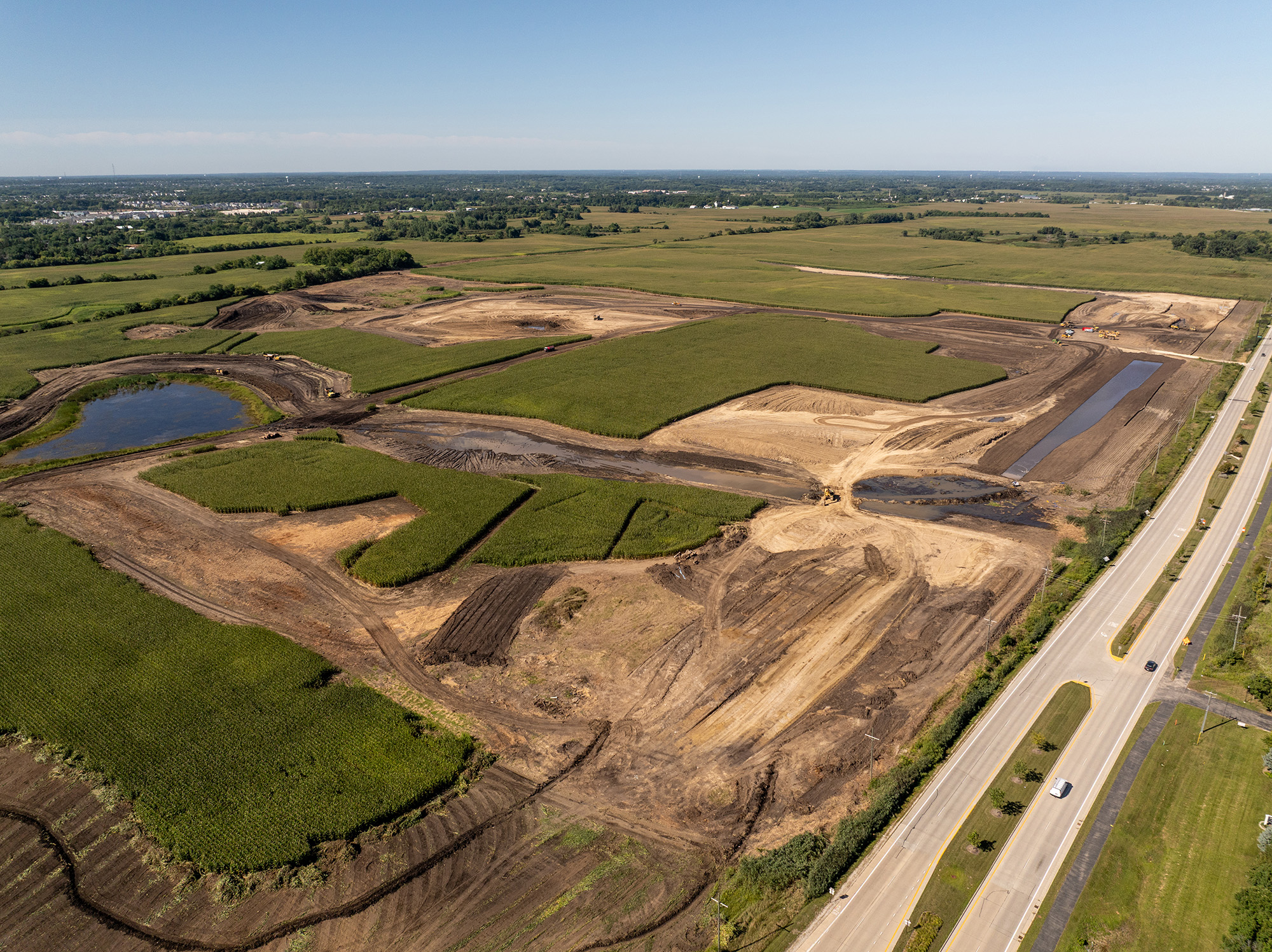 At Cornerstone South in Grayslake, BERGER is executing a large-scale interim grading project to mitigate wetlands and prepare the site for future development. The work spans 100 acres and includes tree removal, topsoil stripping and stockpiling, mass excavation, compensatory storage basins, clay cut and fill, drain tile removals, new storm sewer, and full landscape restoration.